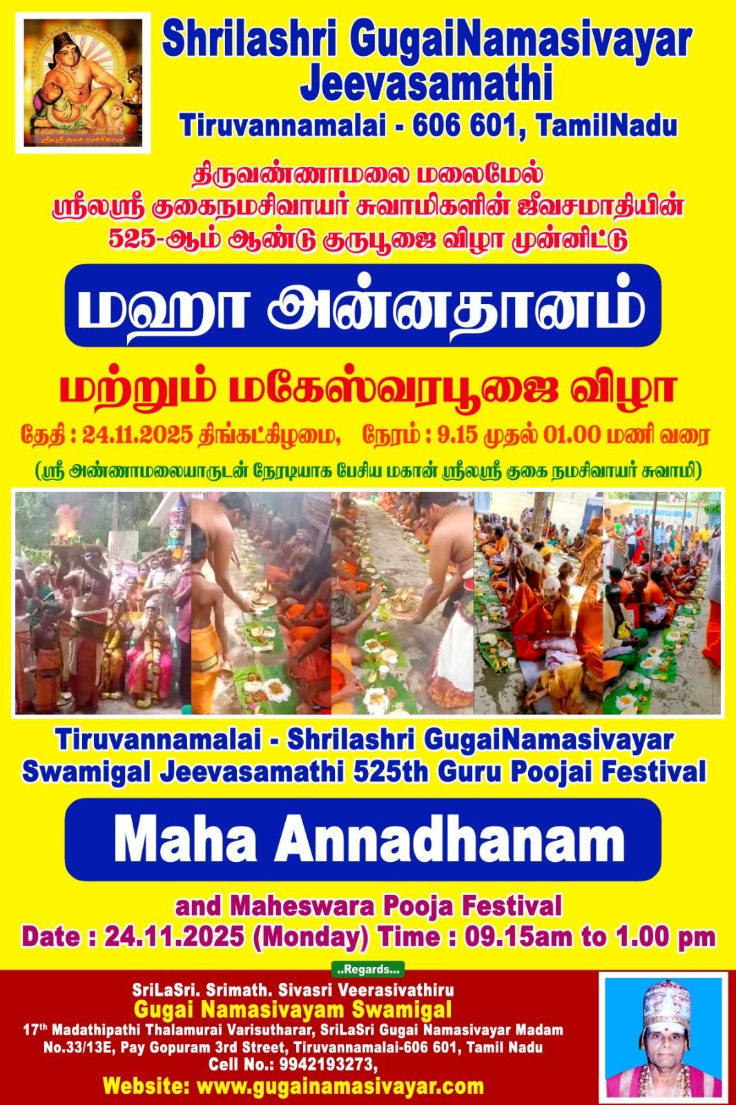 Spoke directly to Shri Arunchaleswarar Temple HistoryGuru PoojaiJeevasamathiPournami Annadanam ShriLaShri Gugai namasivayar17th Madathipathi Thalaimurai Varisutharar Gugai Namasivayar swamigal lived in the mountains of arunachala. He was one among few siddhars who has spoken directly to Lord Annamalaiyar. Read More 0People are Given Annadanam Every Pournami0Years Old Spiritual Guru0Generations Ago The Legacy Started And Still Continued Donate & Get BlessingShriLaShri GugaiNamasivayar Jeevasamathi Pournami Annadhanam ShriLaShri GugaiNamasivayar Jeevasamathi Pournami Annadanam The amount to transfer to this temple trust will be utilized for Annadhanam and Temple maintenance DONATE CharityShriLaShri GugaiNamasivayar Jeevasamathi Pournami Annadanam Raised:₹1.02 lakhGoal:₹10.03 lakh Tiruvannamalai - ShriLaShri GugaiNamasivayar Jeevasamathi ShannathiGuru Pournami (21-06-2024 ) Pournami Annadanam ₹ Donation Amount: ₹100.00₹250.00₹500.00₹750.00₹1,000.00Custom AmountDonate Now Select Payment Method Test Donation Personal Info First Name * Last Name Email Address * Donation Total: ₹100.00 Latest Articles Practices, TemplesTop most beautiful temple complexes in IndiaApril 21, 20200Comments Practices, TemplesHistory of the most famous Hare Krishna holidaysApril 21, 20200Comments Practices, Temples5 most unusual rituals in the Hare Krishna templeApril 21, 20200Comments Practices, TemplesBasic rules and essence of the Hare Krishna movementApril 21, 20200Comments
